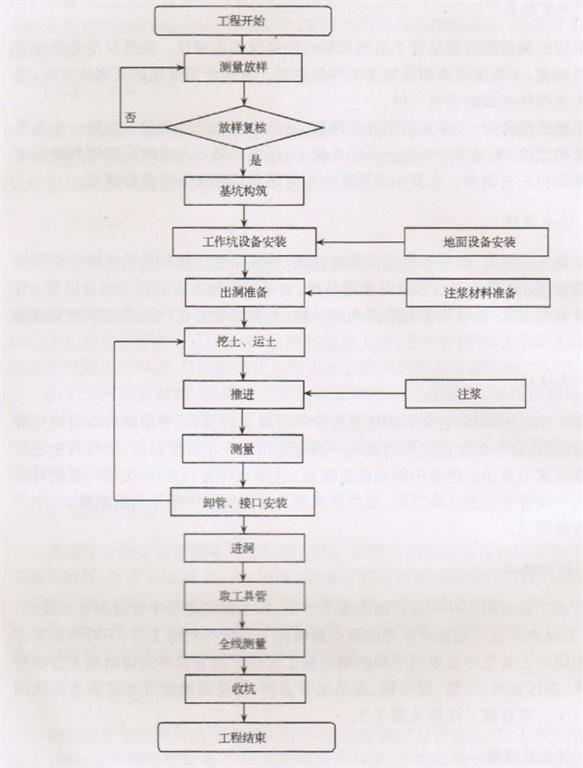 玻璃鋼頂管施工有時(shí)離不開一些輔助的施工方法,如手掘式頂管中常用的井點(diǎn)降水、注漿等,又如進(jìn)出洞口加固時(shí)常用的高壓旋噴施工和攪拌樁施工等。不同的頂管方式以及不同的土質(zhì)條件就采用不同的輔助施工方法。頂管常用的輔助施工方法有井點(diǎn)降水、高壓旋噴、注漿、攪拌樁、凍結(jié)法等多種,都要因地制宜地使用才能達(dá)到預(yù)期的效果。頂管施工流程見圖1·2。